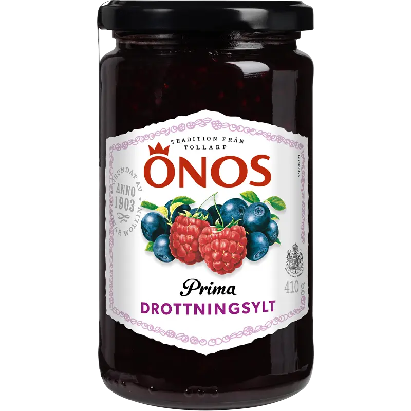 ÖNOS Prima Drottningsylt 410 g – I vårt recept har vi rikligt med mogna blåbär och hallon av finaste kvalité. Det är hemligheten med vår goda drottningsylt. Från lilla Tollarp i Skåne har vi i över 100 år tillagat livsmedelsprodukter av bästa kvalitet. Vi kompromissar aldrig på tillagningsmetoder eller recept när vi producerar vår sylt. Genom att alltid använda de bästa råvarorna kan vi stolt säga att vi vet hur kvalitet ska smaka.